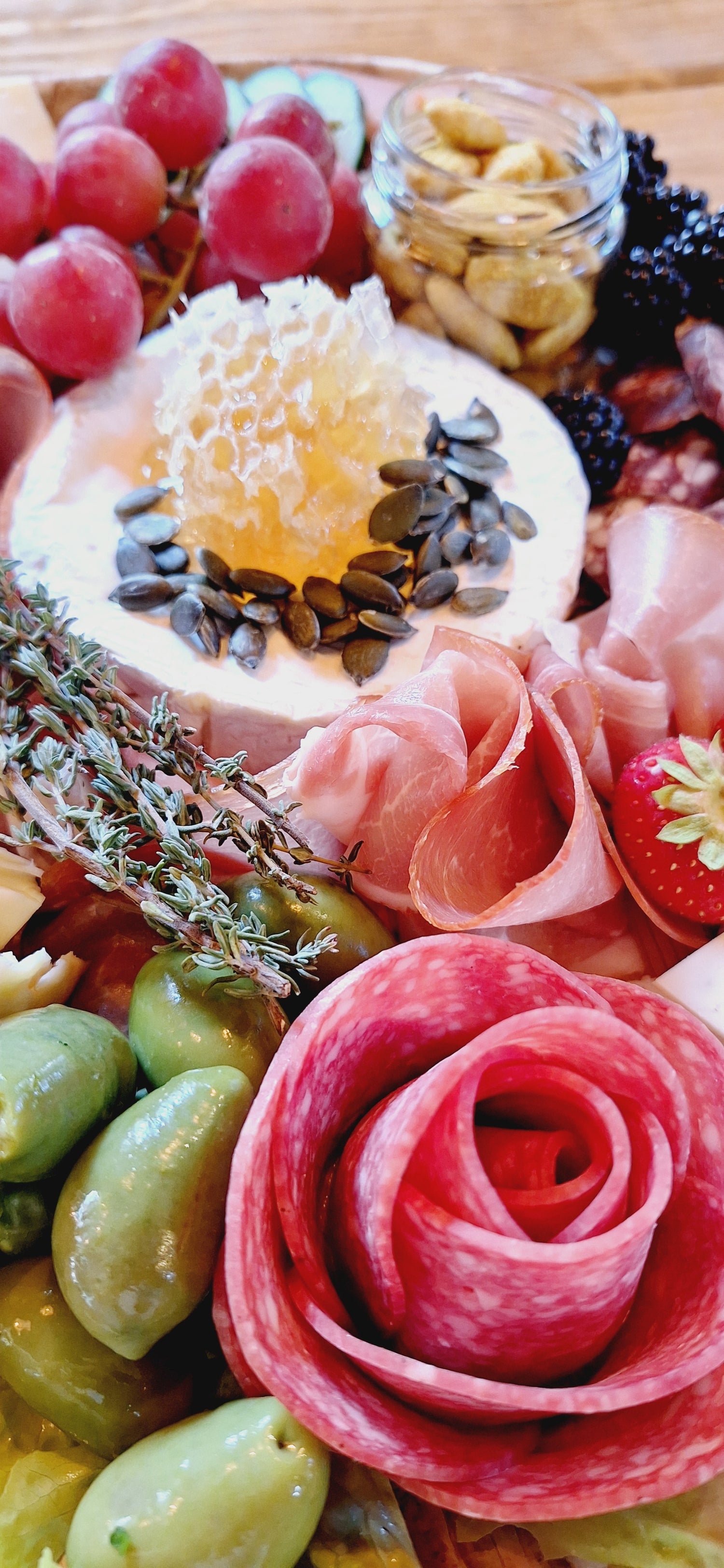 Een plank met de smaak van Heerde en omgeving. Echte boerenkazen, Franse kazen, vers fruit, groente, noten en charcuterie.